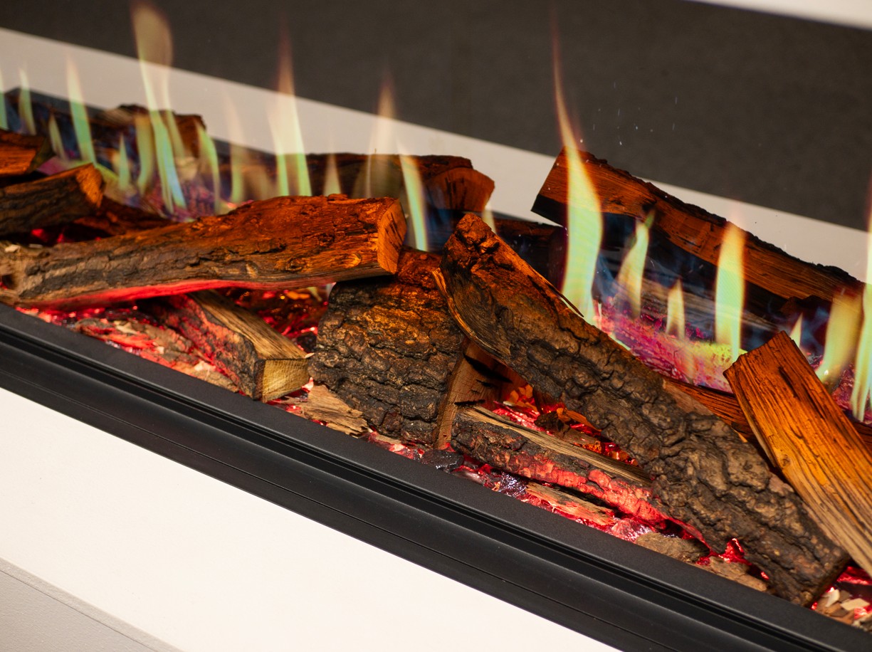 Lepiaki is a recessed LED electric fireplace with extraordinary flame effects. Designed in an extended format, it is glazed on three sides for front, corner or three-sided designs. The standard fireplace decoration is made of realistic ceramic wood logs and a mix of flakes and crystals that simulate a real bed of burning embers with a choice of 13-color palette. The “bright white” flame color can be mixed with the classic fire color. The darkened mirror background gives the flame a crisp, enveloping effect.