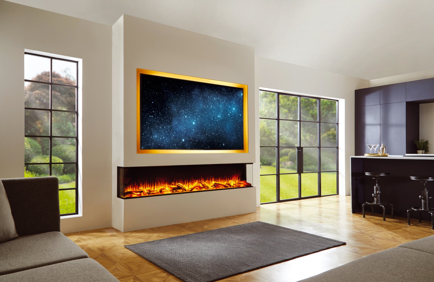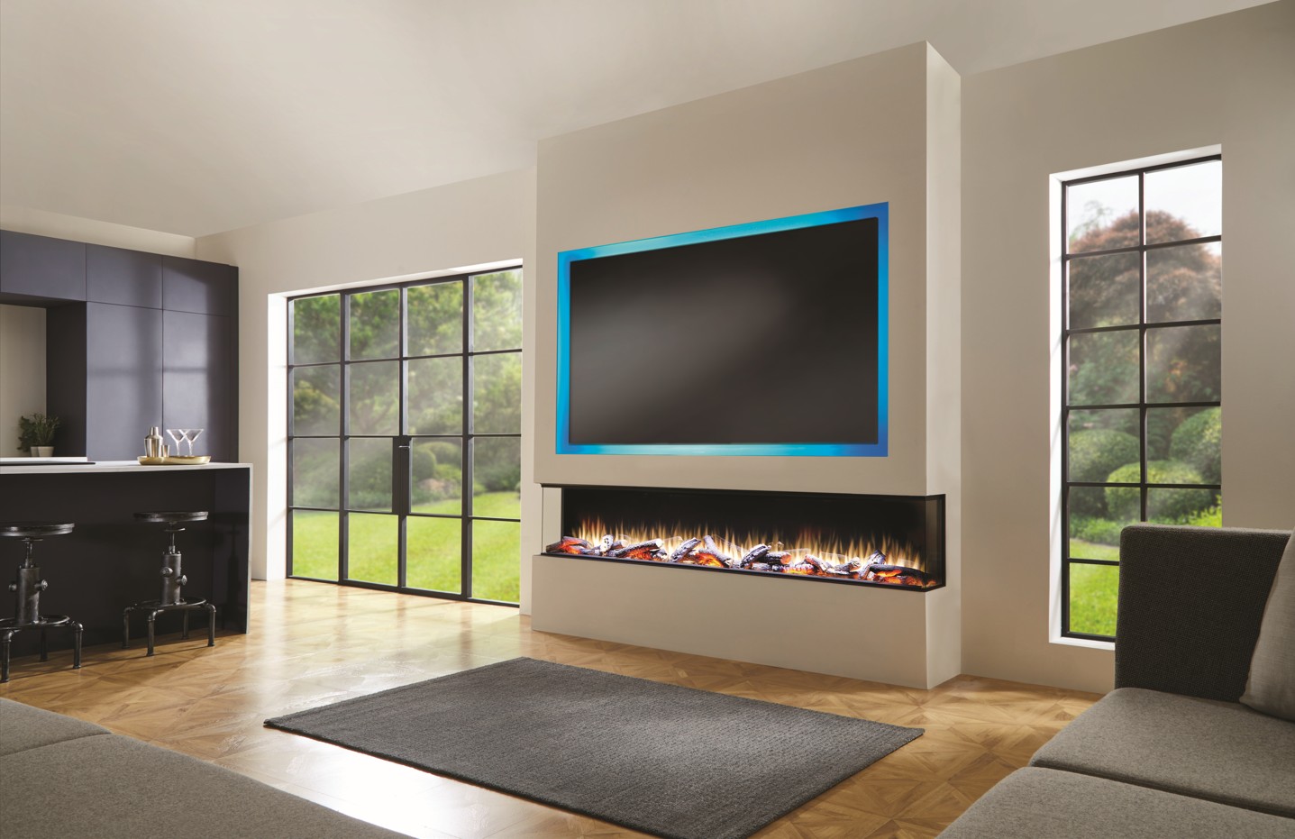 Lepiaki è un caminetto elettrico a LED da incasso, con straordinari effetti fiamma, per creare atmosfere personalizzate. Disegnato in formato esteso, è vetrato su tre lati per progetti frontali, angolari o trifacciali. La decorazione standard del focolare è realizzata con realistici ceppi di legna ceramica ed un mix di scaglie e cristalli che simulano perfettamente un vero letto di braci ardenti. La colorazione della fiamma “bianca brillante”, può essere alternata o miscelata al colore classico del fuoco. Lo sfondo a specchio oscurato conferisce alla fiamma un effetto nitido e avvolgente. La tavolozza di 13 colori del letto di braci permette di scegliere la migliore combinazione con le fiamme per passare gradualmente da una tinta all’altra, ottenere un maggiore effetto di luci e colori, per poter anche “giocare” con soluzioni di illuminazione e ambientazioni diverse e più moderne.